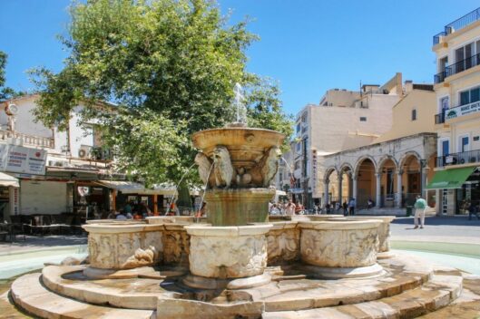 The Morosini Fountain is located in Eleftheriou Venizelos Square (commonly known as Lions Square) in the city center of Heraklion, Crete. It is considered one of the most attractive Venetian monuments of Khandaka (Name of Heraklion of Crete during the Byzantine period) and is preserved in very good condition. The water came from the mountain of Juktas in Archanes with a 15 km aqueduct that reached Heraklion.